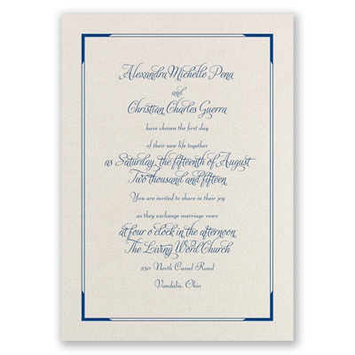 Looking Sharp - Ecru Shimmer - Foil Invitation Description : The two of you are always looking sharp. So should your invitation! Shaded corners highlight your wording on this ecru shimmer wedding invitation. Our Deluxe Collection of wedding invitations features foil stamping. Choose a matte or shimmer foil and up to two lettering styles for your wording. Design and wording print in the same foil color. Invitation includes inner and outer envelopes. Invitations inform your guests of your event details and set the tone for your celebration. Consider ordering 25 additional invitations for mementos and any oversights.